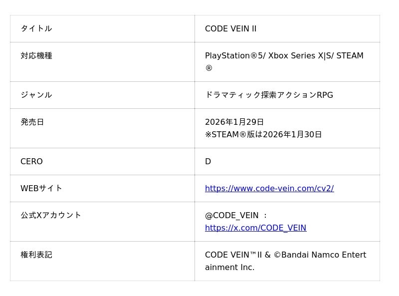 2026年1月29日(STEAM(R)版のみ1月30日)発売予定のドラマティック探索アクションRPG『CODE VEIN II』についてキャラクターカスタマイズ無料体験版「『CODE VEIN II』 Character Creator Demo」を本日1月23日より配信開始したことをお知らせいたします。