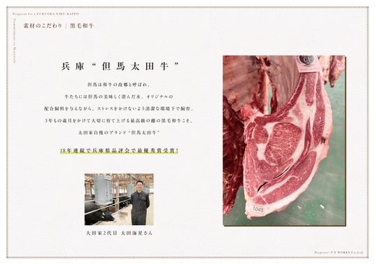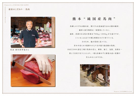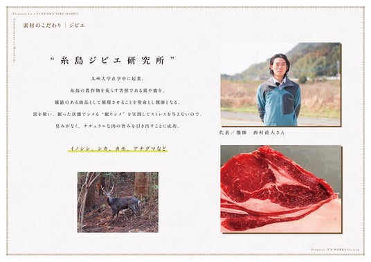 最高級ブランド「太田家但馬牛」、濃厚な旨みと甘みがある「未冷凍の熊本馬肉」、そして、ナチュラルな肉の旨みをもつ鮮度抜群の「糸島ジビエ」。 私たちが扱うのは、それだけで主役となり得る希少な肉たちです。