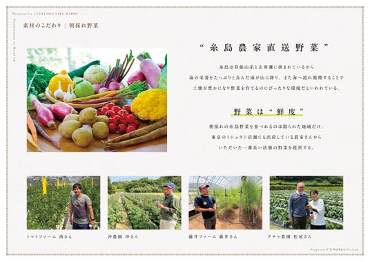 主役は肉だけにあらず。 朝露をまとった糸島野菜の瑞々しさ、走り・旬・名残を映した魚介や食材。