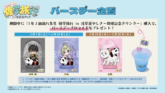 上記期間中に「3年Z組銀八先生 修学旅行 in 浅草花やしき~開催記念ドリンク~」を購入いただくと「バースデーブロマイド」を1枚プレゼント ※数量限定