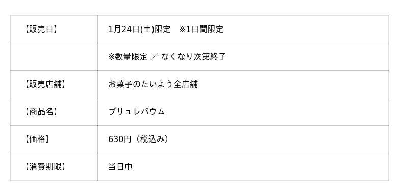 株式会社太陽社(所在地:千葉県匝瑳市飯倉293、代表取締役:片岡正裕)が展開する、千葉県で長年愛され続ける菓子店「お菓子のたいよう」は、年に一度、冬だけに登場する限定スイーツ「ブリュレバウム」を、2026年1月24日(土)限定で販売いたします。千葉県産米粉100%の筒型バウムクーヘンに、たっぷりのカスタードを流し込み、表面をパリッと香ばしくキャラメリゼした本商品は、毎年フレーバーを変えて展開する大人気シリーズ。今年はシリーズ初となる苺カスタード仕立てで登場します。