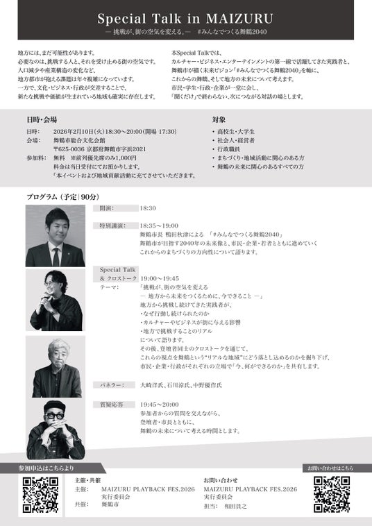 2026年2月10日(火)、舞鶴市総合文化会館にて、カルチャー・ビジネス・エンターテインメントの第一線で活躍する実践者を招いた特別講演会「Special Talk in MAIZURU #みんなでつくる舞鶴2040」を開催します。地方都市を取り巻く環境が変化する中、市民・企業・行政が共に2040年の未来を考える機会を創出します。