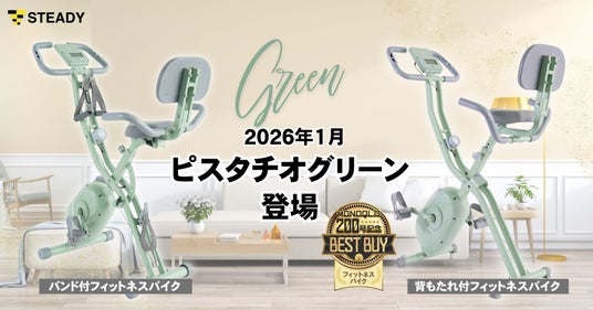2018年のブランド展開開始から、SNSやカスタマーサポートで既存製品に対するお客様の声を拾い上げ、日本人の体格や考え方、住環境、ライフスタイルに配慮したホームフィットネス / ストレッチ製品を提案し、日本においてトップクラスのEC販売実績を誇るステディジャパン株式会社(本社:東京都新宿区、代表取締役CEO:森 由樹)は、累計8万台超の販売実績を誇るロングセラー製品「STEADYフィットネスバイク」シリーズより、「STEADY背もたれ付きフィットネスバイク」と「STEADYバンド付きフィットネスバイク」の新色ピスタチオグリーンを、2026年1月23日(金)よりSTEADY公式サイト、総合オンラインストアAmazon.co.jp、楽天市場などにて発売します。