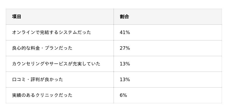 - クリニックを選んだ決め手は「オンラインで完結するシステムだった」ことが41%で最多
