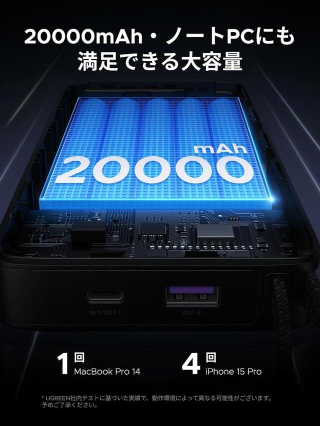 単一ポートで最大67W出力に対応し、PD 3.0/PPS(20W・45W・65W)など、主要な高速充電プロトコルをカバー。MacBook Pro 14インチを約1回フル充電できる20000mAh(72Wh)の大容量で、スマートフォンなら約4〜5回充電可能です。