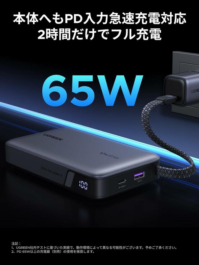 本体への入力も65W PD急速充電に対応し、約2時間でフル充電できるので、出張や旅行時にも安心。100Wh未満のため機内持ち込み可能なのも安心材料です。