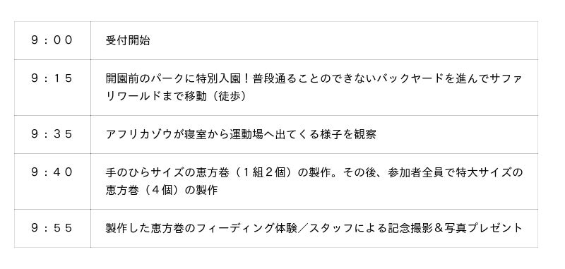 開園前の静かなパークに特別入園し、アフリカゾウが寝室から運動場へ踏み出す瞬間を観察いただけます。さらに、アフリカゾウの長寿を支える「食事」についてスタッフからのレクチャーを聞いて、手のひらサイズの恵方巻と白菜を丸ごと1玉使った特大恵方巻を手作りし、アフリカゾウへ直接プレゼントしていただきます。