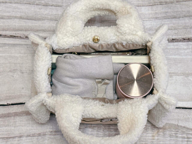 本体はスウェード調の生地で、持ち手や上部、サイドにボア調生地を使用したフェイクムートン仕様。ベージュ×アイボリーの配色が、王道ながらも上品で大人かわいい印象♪