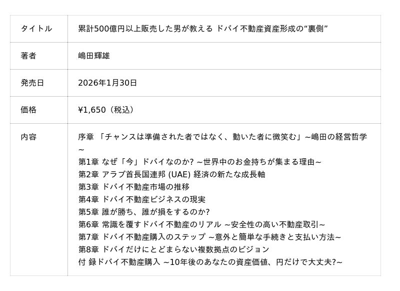 イベント開催の背景本イベントは、単なる出版記念に留まりません。書籍の著者である創業者(CEO 嶋田輝雄、COO 細山翔矢)が登壇し、当社の企業理念と海外不動産市場へのビジョンを直接お伝えします。書籍タイトル『累計500億円以上販売した男が教える ドバイ不動産資産形成の“裏側”』は、私たちのミッション「海外のマーケットであっても透明性とおもてなしを基盤に、お客様の多様な不動産ニーズに対応すること」そのものです。本書の理念を具現化し、海外不動産投資のリアルを体感いただく機会として、本イベントを企画いたしました。