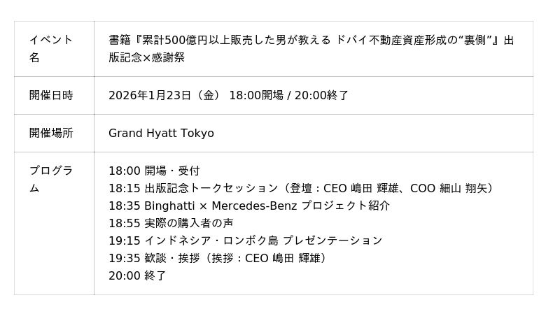 ドバイ不動産で累計500億円超の販売実績を持つEXCEED創業者が、1月23日に出版記念イベントを開催。メルセデス・ベンツとの協業やインドネシア・ロンボク島での新事業、注目プロジェクトを初公開します。