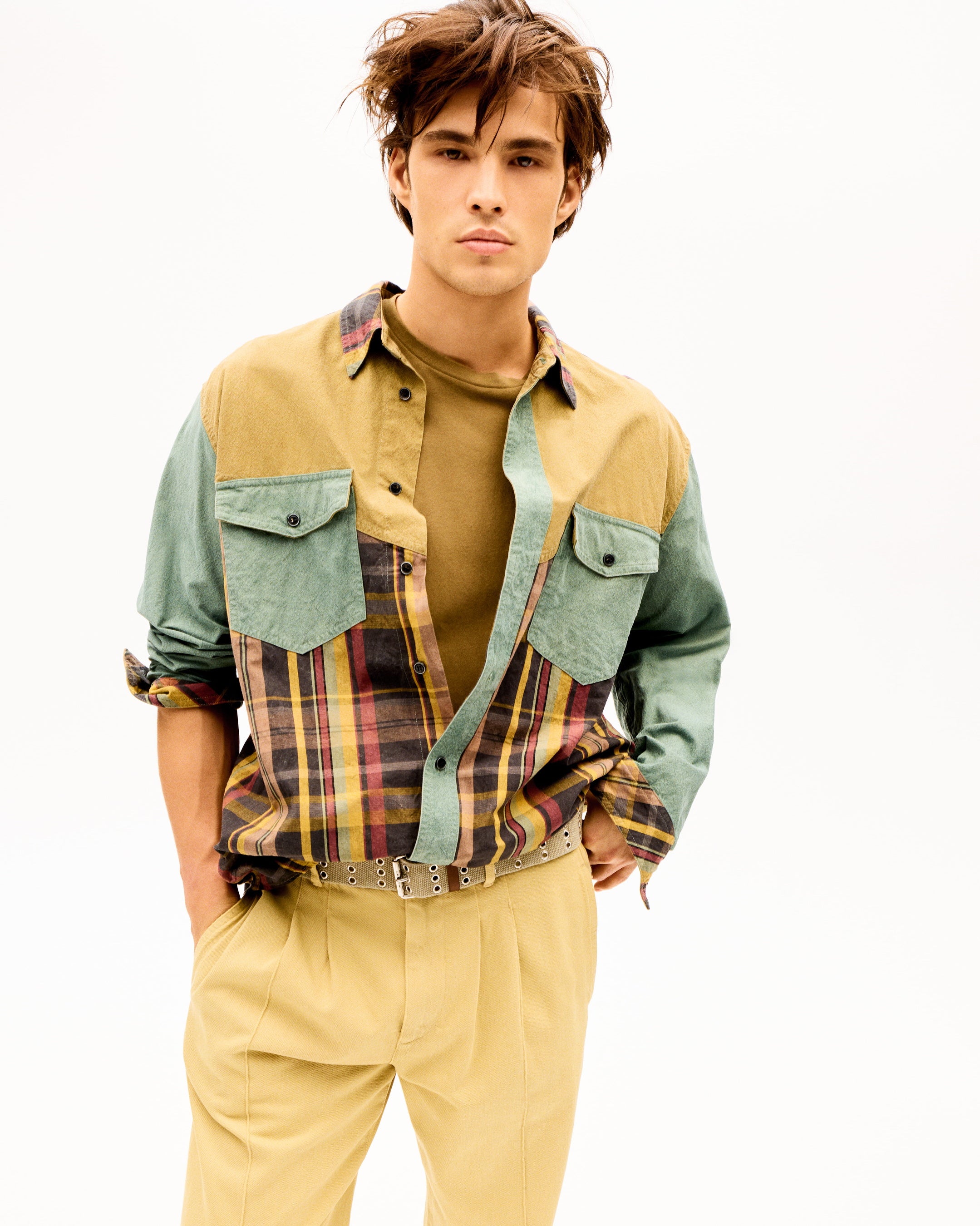 袖を無造作にロールアップし、プリーツパンツにタックインしたシャンブレーシャツ、素肌に直接纏うケーブルニット、完璧なフィット感のクルーネックTシャツなど、随所に気負いのない官能性が宿ります。プレイド柄やチェックのポプリン、ウォッシュドスウェットが、控えめでカレッジライクなリラックス感をもたらします。