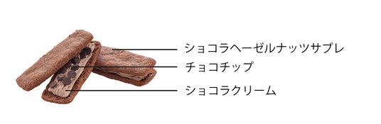 上質なココアパウダーを加えたコクのあるヘーゼルナッツサブレ生地に、くちどけなめらかなショコラクリームとカリッとチョコチップをサンドしました。
