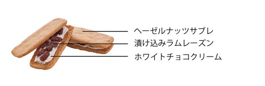 芳醇でコク深いヘーゼルナッツパウダーを練りこんだサブレ生地に、くちどけなめらかなホワイトチョコクリームと、上品な香りと旨味が詰まったラム酒漬けレーズンをサンドしました。