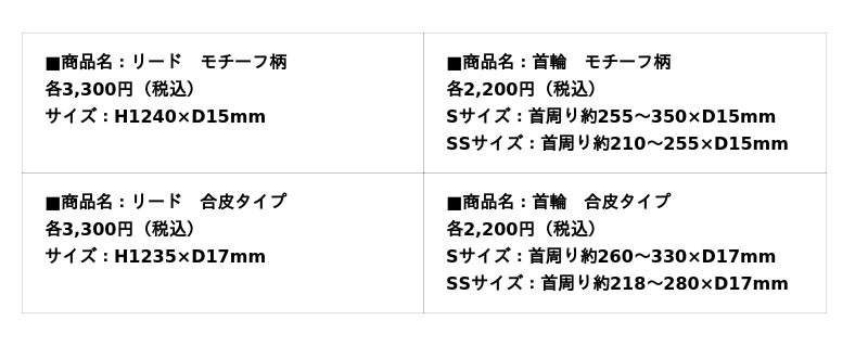 モチーフ柄タイプ:『ちいかわ』デザインのブルー・ピンクの2色展開。首輪には、ちいかわ・ハチワレ・うさぎの3種類のプレートチャームが付属しており、その日の気分に合わせて付け替えが可能です。リードの持ち手部分には、ブルーには星形、ピンクにはハート形のワンポイントチャームが付いています。