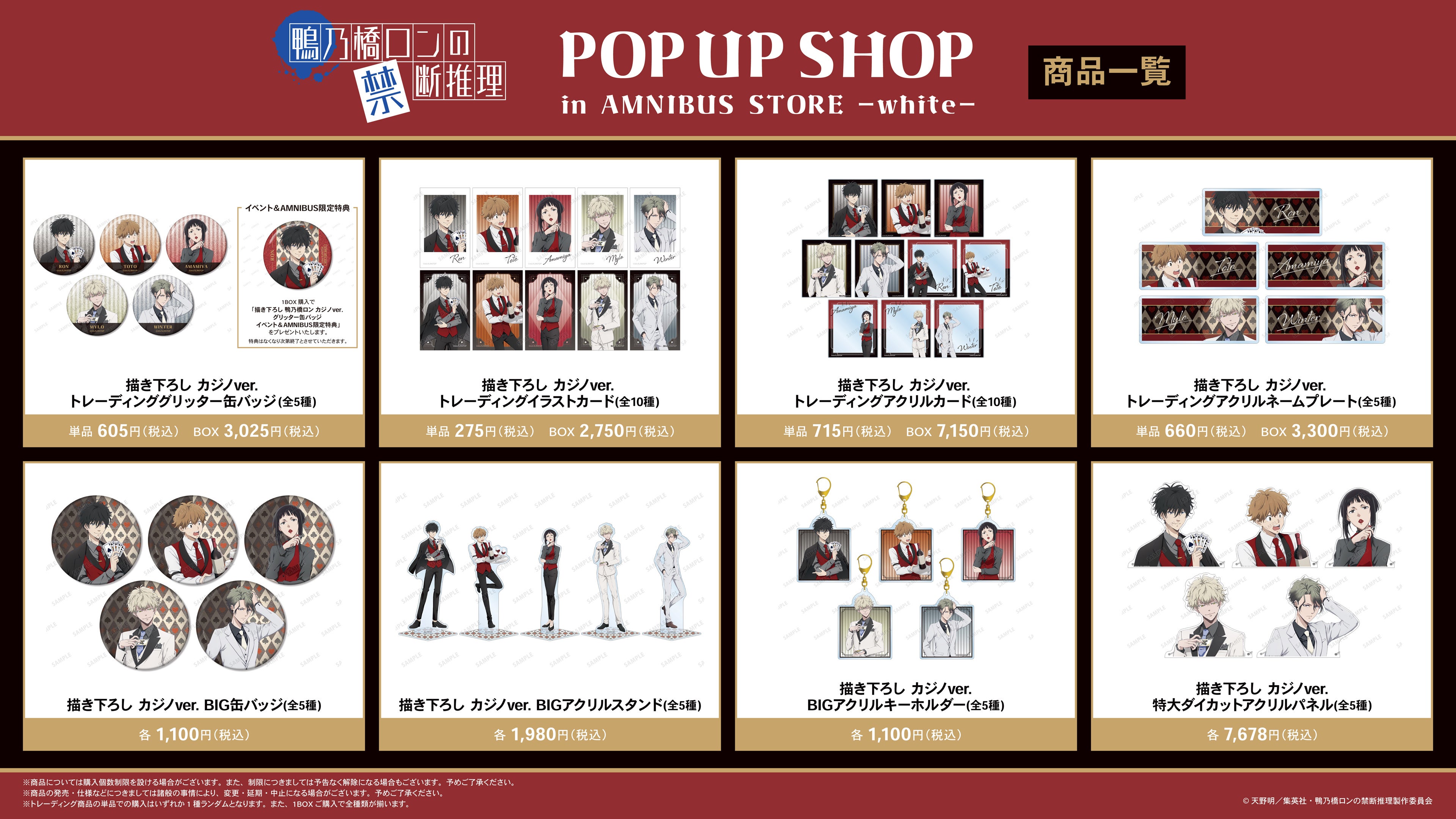 今回のイベントでは、TVアニメ「鴨乃橋ロンの禁断推理」より「カジノ」をコンセプトにした過去描き下ろしイラストを使用した新作グッズを多数先行販売する他、AMNIBUS STORE -white-購入特典の配布を予定しております。