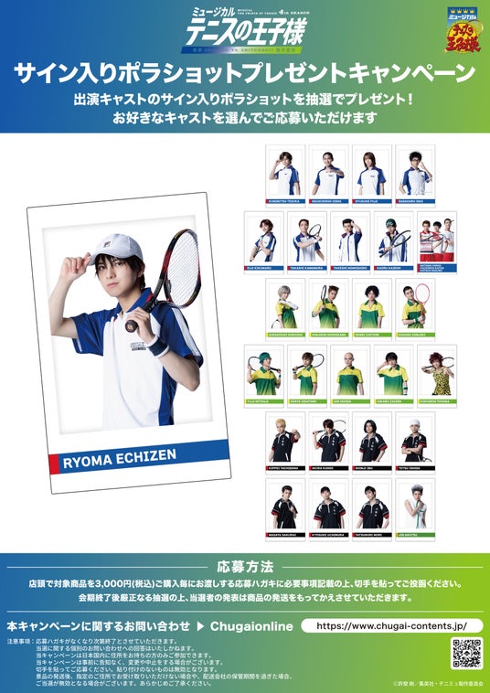 店頭で対象商品を3,000円(税込)ご購入毎にお渡しする応募ハガキに必要事項を記入の上、切手を貼ってご投函いただいたお客様から抽選で「出演キャスト様サイン入りポラショット」をプレゼントいたします。