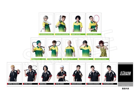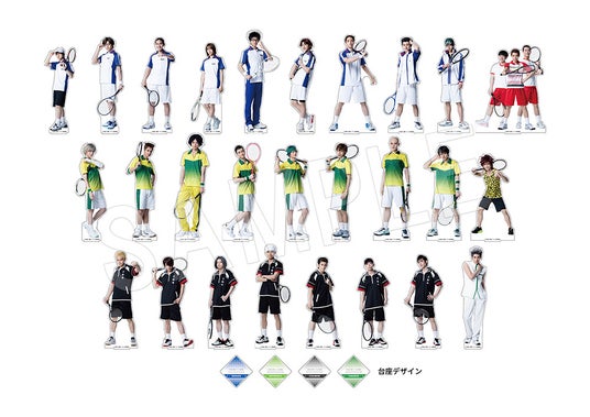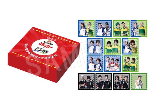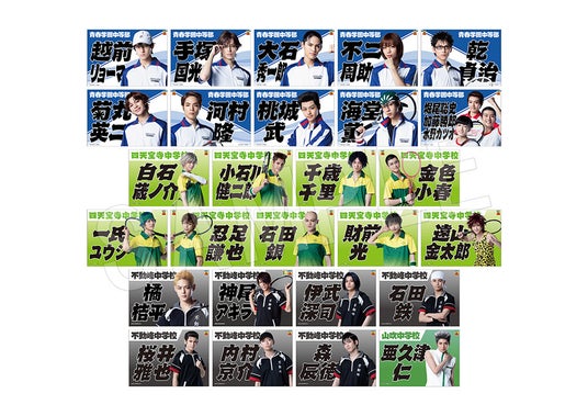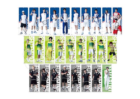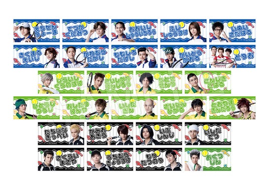 ラインナップ:越前リョーマ、手塚国光、大石秀一郎、不二周助、乾 貞治、菊丸英二、河村 隆、桃城 武、海堂 薫、トリオ、白石蔵ノ介、小石川健二郎、千歳千里、金色小春、一氏ユウジ、忍足謙也、石田 銀、財前 光、遠山金太郎、橘 桔平、神尾アキラ、伊武深司、石田 鉄、桜井雅也、内村京介、森 辰徳、亜久津 仁(全27種)