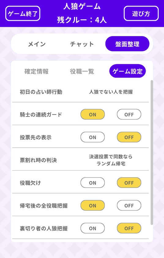役職構成だけでなく、投票結果の表示、票割れ時の処理、各種行動ルールなど、細かなゲーム設定も柔軟に調整可能。