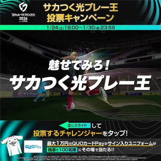 株式会社セガは、2026年1月22日(木)より配信開始したPlayStation(R)5/PlayStation(R)4/iOS/Android/PC(Steam)向けゲーム『プロサッカークラブをつくろう!2026』(以下、『サカつく2026』)について、「サカつく」シリーズおなじみの「光プレー」にインフルエンサーたちが挑戦する企画動画「魅せてみろ!サカつく光プレー王!」を公開しました。さらに、動画の公開を記念して、豪華賞品が当たる「サカつく光プレー王投票キャンペーン」を開催します。