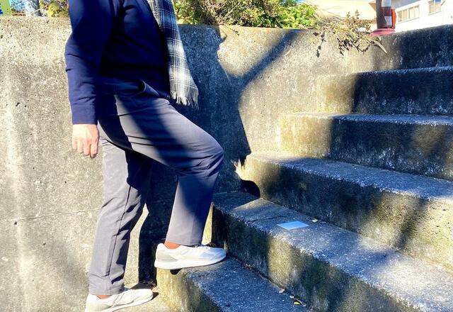 膝周りや腰回りの生地の縫い合わせに工夫があり、歩きやすさはなかなかのもの。つっぱり感なく、足をスムーズに動かせます。