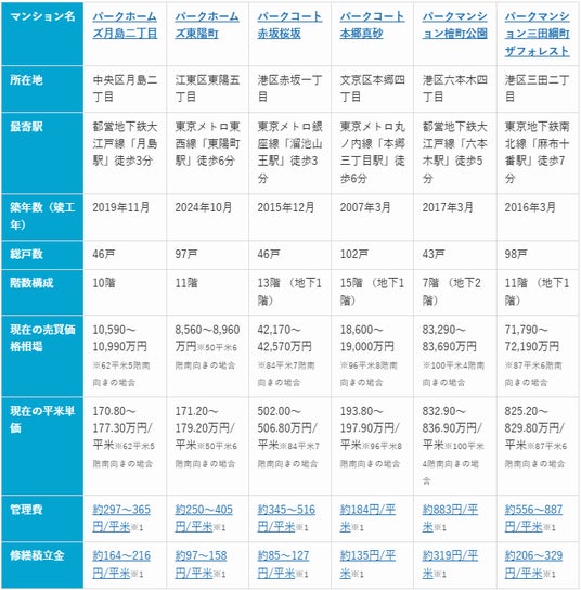 調査対象物件:パークホームズ月島二丁目/パークホームズ東陽町/パークコート赤坂桜坂/パークコート本郷真砂/パークマンション檜町公園/パークマンション三田綱町ザフォレスト