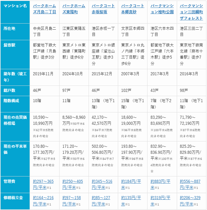 調査対象物件:パークホームズ月島二丁目/パークホームズ東陽町/パークコート赤坂桜坂/パークコート本郷真砂/パークマンション檜町公園/パークマンション三田綱町ザフォレスト