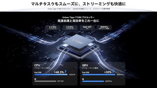 オクタコアのUnisoc Tiger T7280プロセッサーと最大24GB RAM(6GB+18GB拡張)により、マルチタスクでもスムーズな操作性を実現。256GB ROMを標準搭載し、最大2TBのTFカード拡張に対応。学習や仕事、エンターテインメントまで幅広く活用できます。