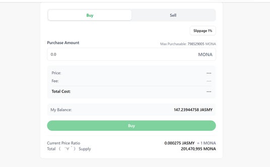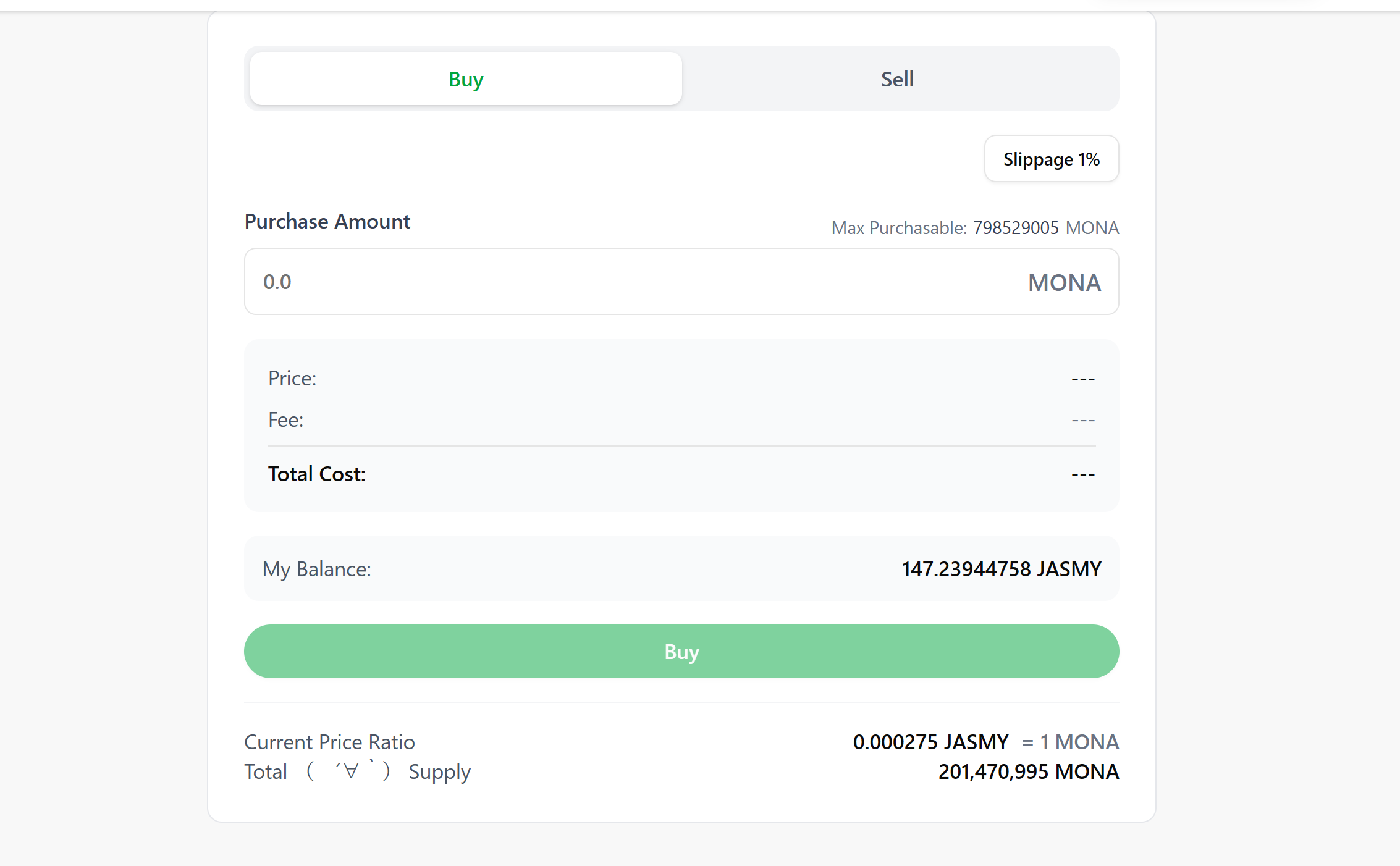 コイン詳細画面内から Buy / Sell を選択し、購入数量(Purchase Amount)を入力して操作を進めます。