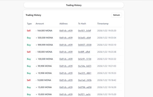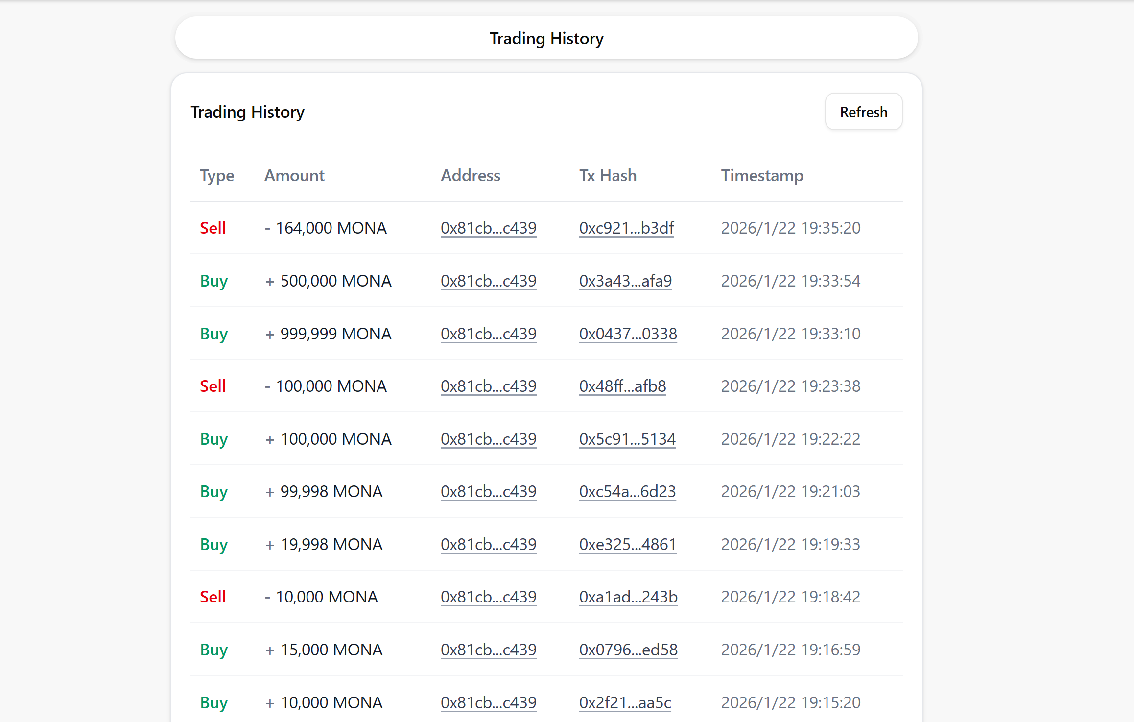 Trading History では、Buy/Sellの履歴、数量(Amount)、アドレス、Tx Hash、タイムスタンプ等を一覧で確認できます。