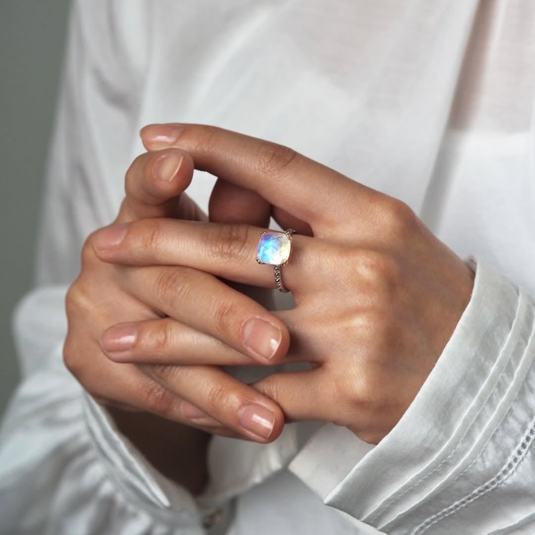 軽やかな着け心地と指馴染みの良さに加え、宝石の裏側まで見渡せる構造も、「リーベル ライト」ならではの魅力です。透明感のある石は光を通して表情を変え、インクルージョンを含む石は、角度によって異なる景色を楽しめます。