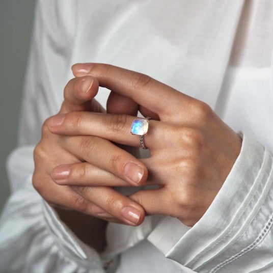 大粒の宝石が放つ光と、指に沿うように設えたアームのバランスが手元に静かな華やかさを添える
