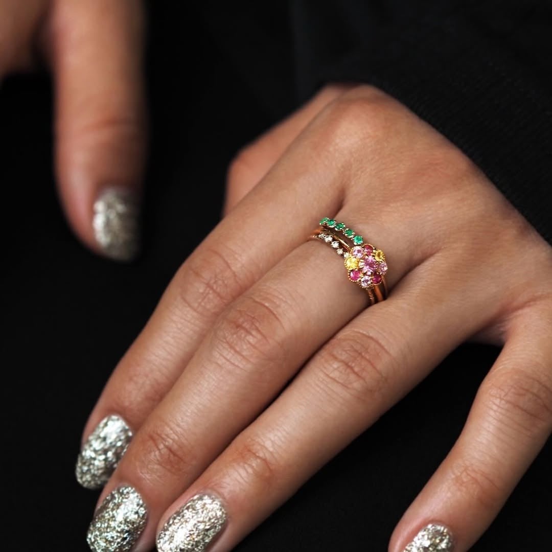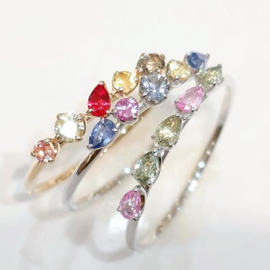 一部には淡いピンクダイヤモンドを配したものもあり、グリーンやピンクのサファイアと組み合わせることで、指先に春を思わせる彩りを添えます。