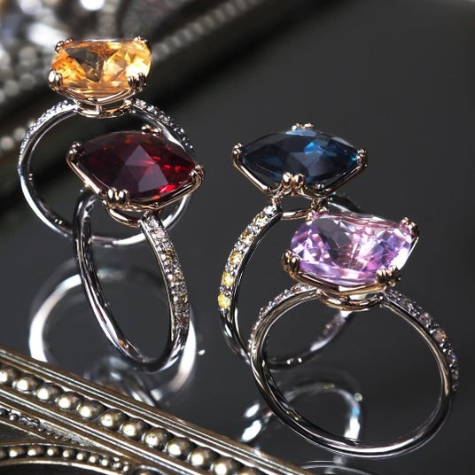 爪の向きや数に変化をつけることで、宝石が軽やかに動くような印象を持たせています。ラウンド、オーバル、ペアシェイプといった異なるカットの宝石を用い、配置や向きの違いから3種類の構成を展開。花の蕾を思わせる丸みのある石座と、細部まで調整した爪留めが、色彩の広がりを引き立てます。