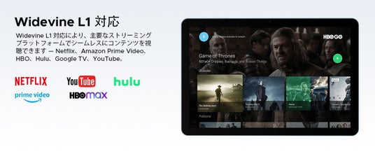また Widevine L1 に対応しており、NetflixやYouTubeなどの動画配信サービスを高画質で楽しめるため、動画視聴用タブレット としても高い満足度を実現しています。