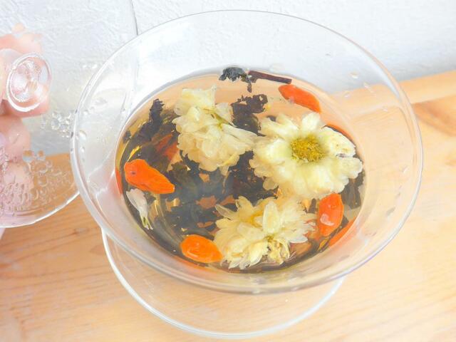 蓋をそっと取ると、茶葉に含まれていた花がふわりと開いていて、思わず見入ってしまいました。