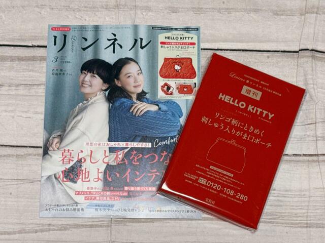 2026年1月20日(火)発売の雑誌『リンネル』3月号増刊には、ハローキティの「刺しゅう入りがま口ポーチ」が付録として付いてきます。