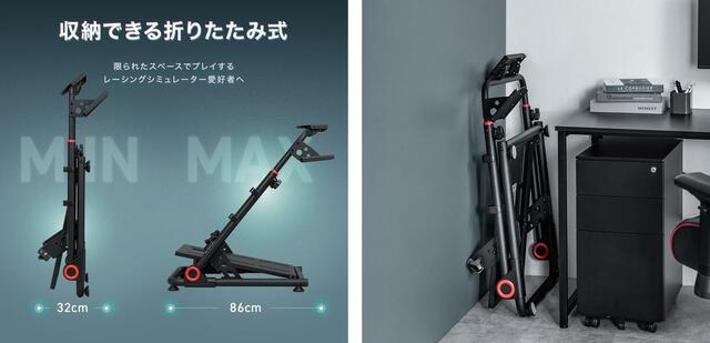 臨場感に加えて重厚感とコンパクト収納も兼ね備え、レーシングシミュレーター愛好家の心を燃やすアイテムです!