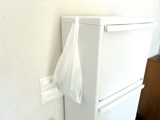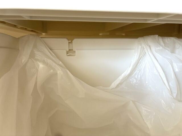 手で探るとフックがあり、レジ袋の取っ手を引っ掛けられます。