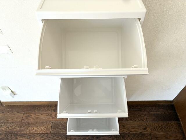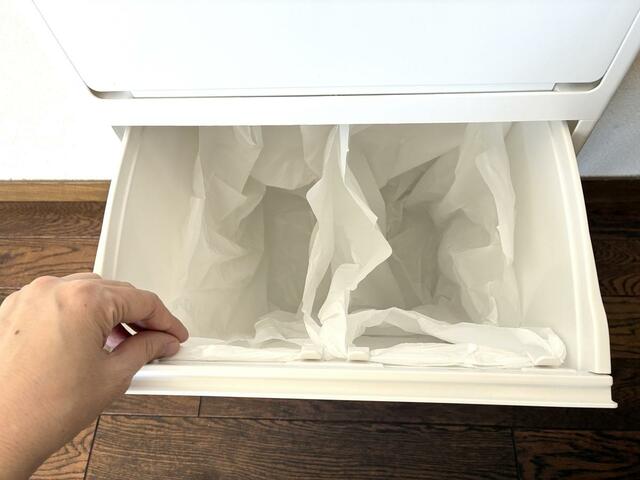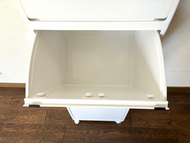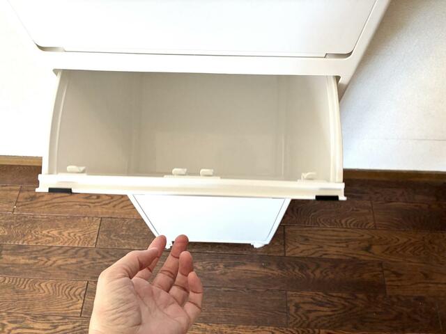 各段の引出しは、軽く引き出して手を放したら、勝手に閉まってくれるのでゴミ箱の閉め忘れ防止に。