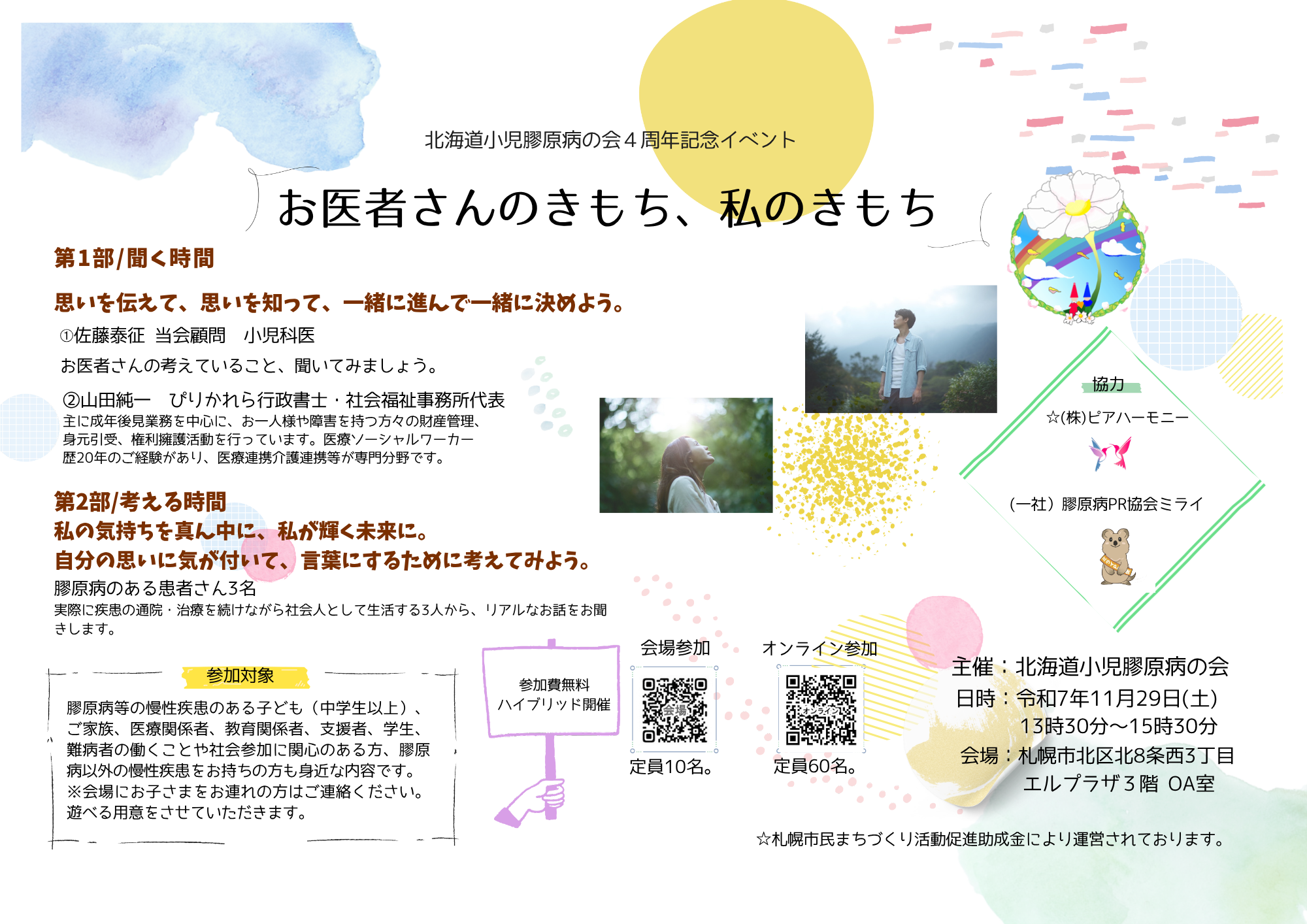 北海道小児膠原病の会(代表:さくま しほこ、2021年12月25日設立)は、2025年11月29日(土)、札幌エルプラザおよびオンラインによるハイブリッド形式で、設立4周年記念イベント