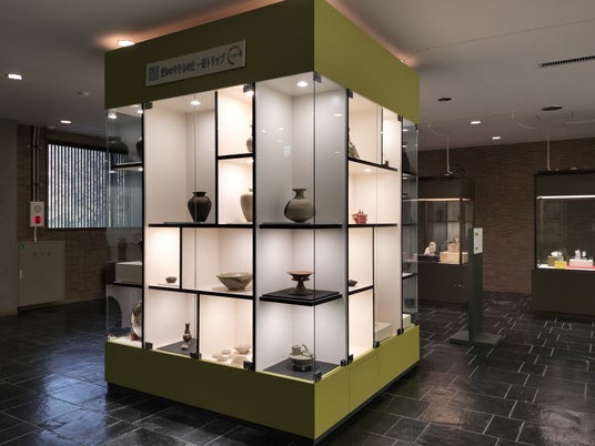 1.愛知のやきもの史一周トリップロビー中央の柱を囲む高さ約3mの4面ガラスケースが、展示空間の入口としてお客様を迎え、新しい展示のワクワク感を演出します。ケースの中には愛知のやきものが展示されており、ぐるりと一周することで、愛知で作られてきた紀元前から現代までのやきものについて知ることができます。