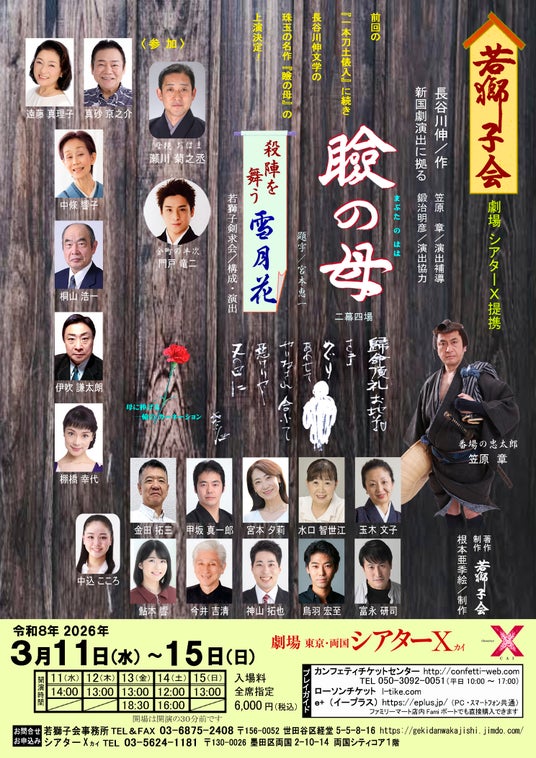 『瞼の母』『殺陣を舞う 雪月花』が2026年3月11日 (水) ~ 2026年3月15日 (日)にシアターX(シアターカイ)(東京都 墨田区 両国 2-10-14)にて上演されます。