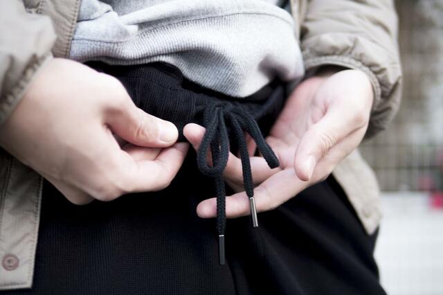 裾をめくると調整ゴムがついているのでこちらを絞ると。