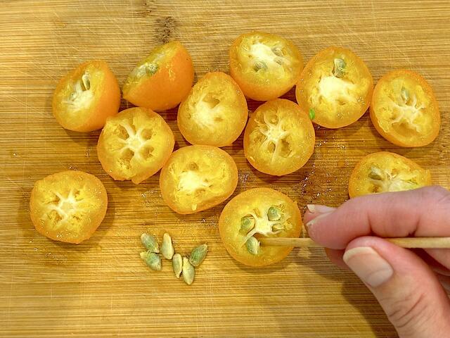 1. 金柑はヘタを取り除き、ゆでるときに破裂するのを防ぐために竹串で表面に8〜10カ所ほどの穴を開ける。
