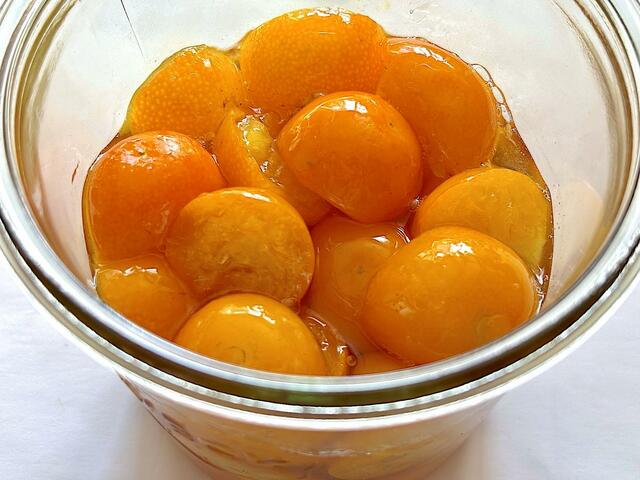 4. 清潔な容器に金柑を入れ、はちみつを注ぎ入れる(金柑がはちみつの液面から出ていたら、はちみつを足す)。粗熱がとれたらふたをして、冷蔵庫でひと晩おく。皮がやわらかくなったら完成。