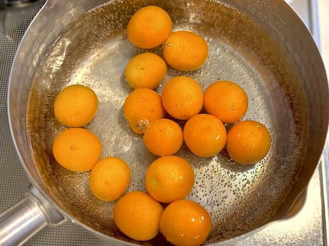2. 鍋に湯を沸かし、沸騰したら金柑を入れて4分ほどゆでる。ざるにあげ、キッチンペーパーなどで水けをしっかりと拭きとる。