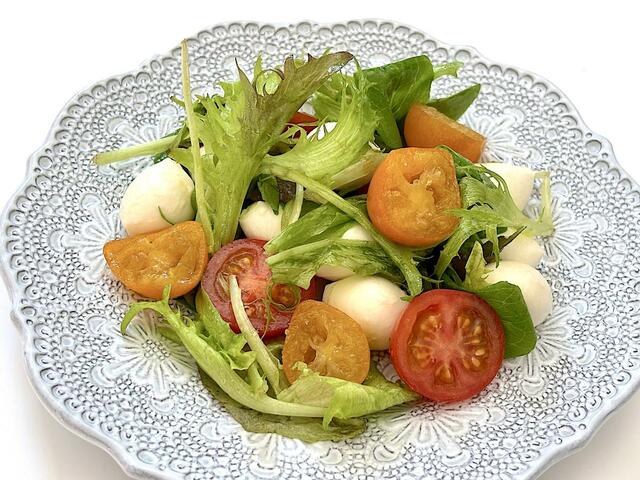 サラダにもぴったり。これはサラダ菜とミニトマト、モッツァレッラチーズと金柑を、オリーブオイルと塩で和えた一品です。