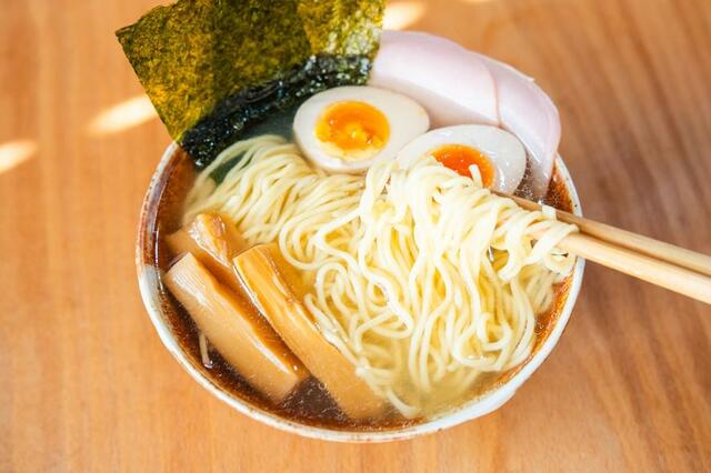 湯切りした麺をスープに入れて、最後にお好みでトッピングをのせたら完成。