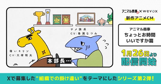 People Tech(テクノロジーによって人の可能性を拡げる)事業を展開する株式会社アトラエ(本社:東京都港区、代表取締役CEO:新居佳英、東京証券取引所プライム市場:6194、以下 アトラエ)は、組織力向上プラットフォーム「Wevox(ウィボックス)」の新作アニメCM「アニマル商事~ちょっとお時間いいですか篇~」を、2026年1月26日(月)より配信開始いたします。