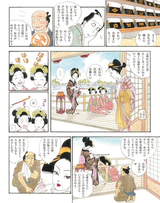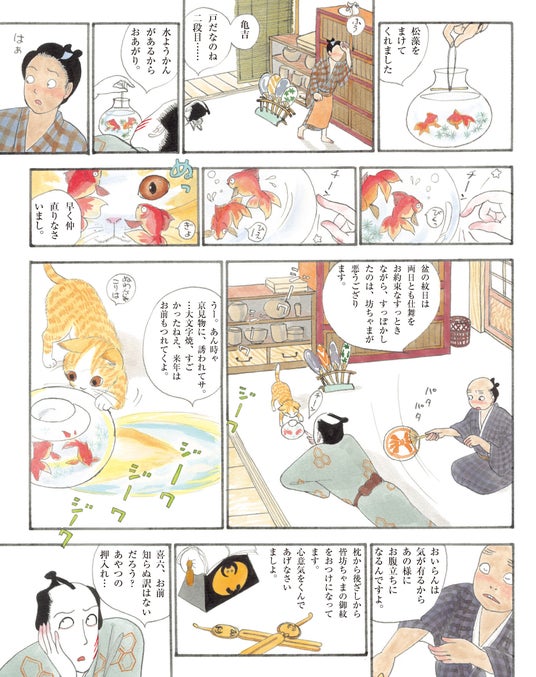 『百日紅』『合葬』『おーい、応為』と映画化作品も多く、没後も熱い支持を集める杉浦作品ですが、その中でも本作『花のお江戸の若旦那』は、洒脱でユーモアあふれる江戸の暮らしを、“粋”な若旦那・福太郎の目線で描く、「彩色江戸漫画」という珍しい作品です。